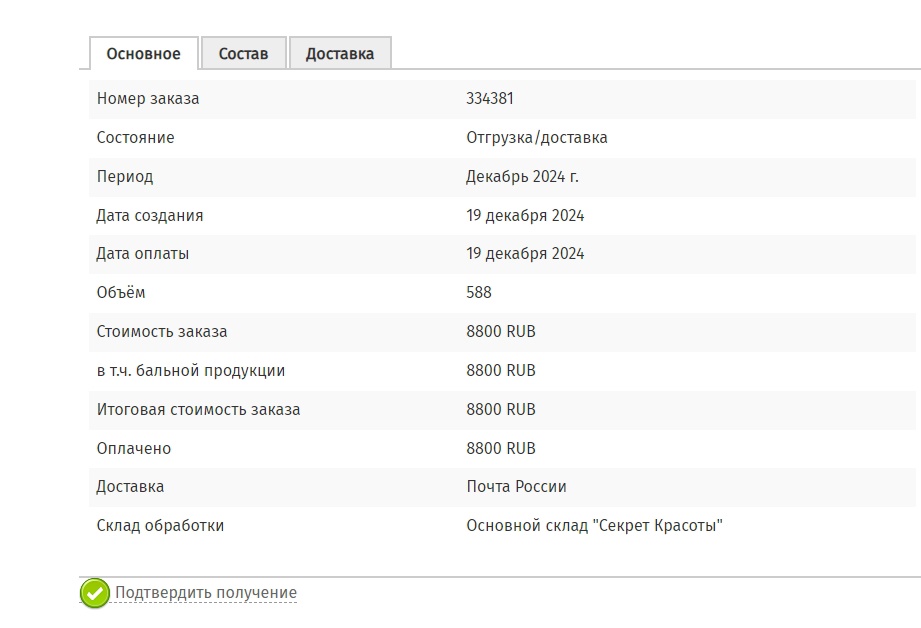 - Ознакомьтесь с бланком заказа. В нём вы найдёт информацию о составе, стоимости, условиях доставки заказа, а также индивидуальный код получения.