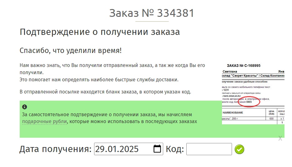 Важно! Для начисления необходимо подтвердить получение заказа следующим образом: