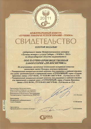 ООО Научно-производственная лаборатория «ЛН-Косметика» награждена золотой медалью отборочного этапа Межрегионального конкурса «Лучшие товары и услуги Сибири – ГЕММА-2011» по Новосибирской области.