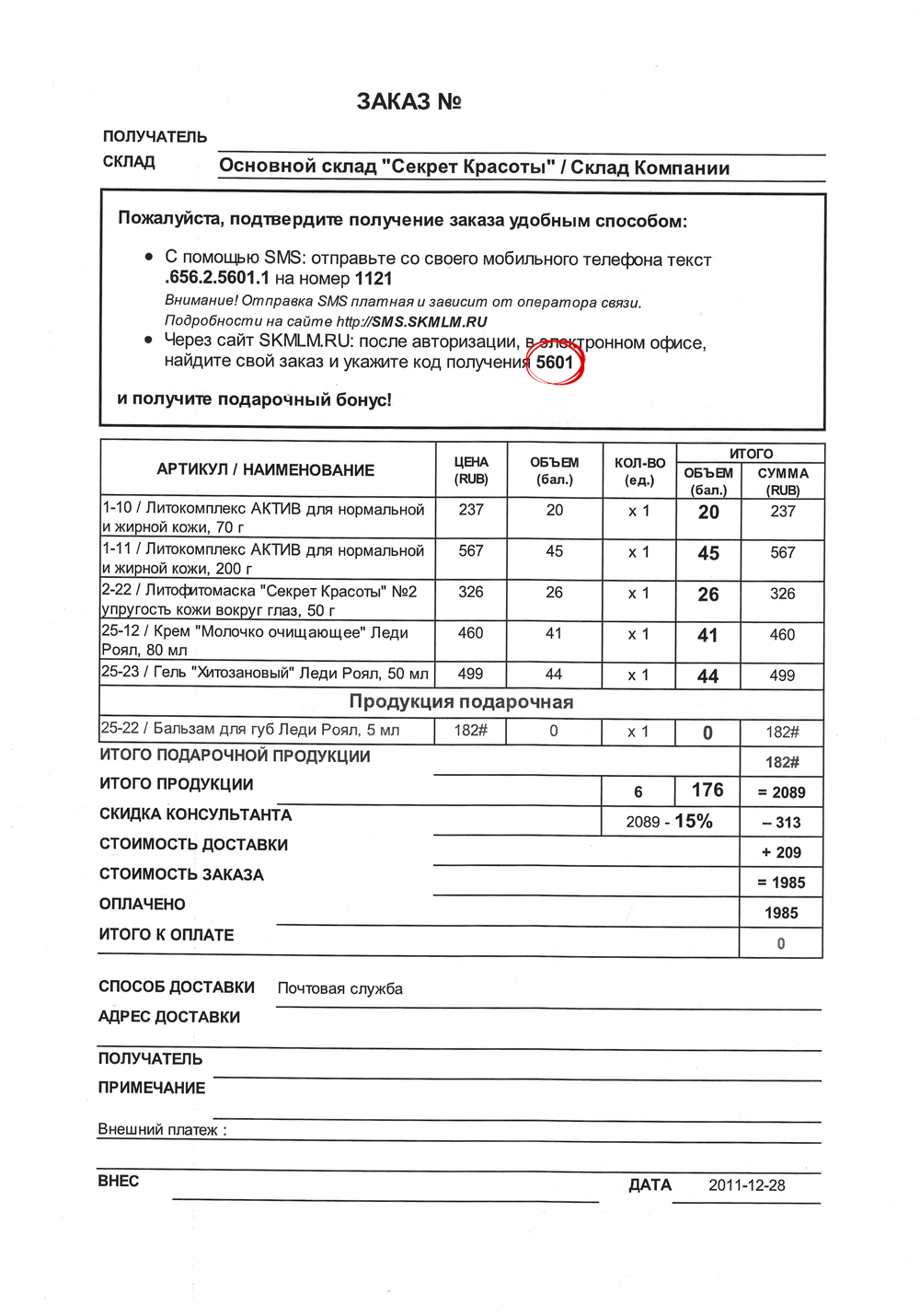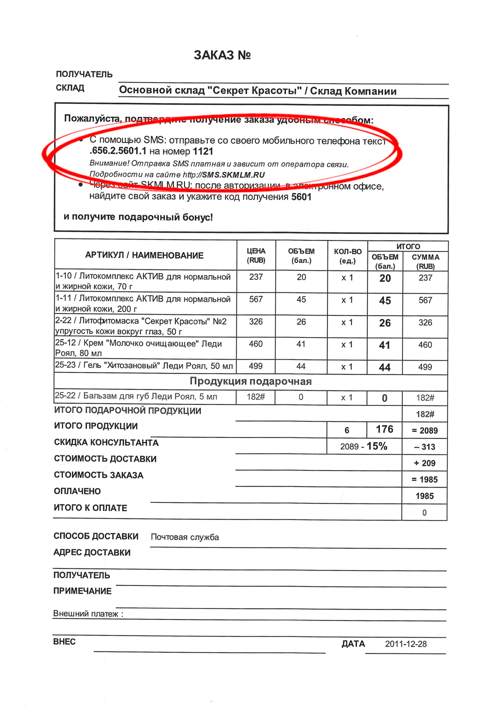 - Ознакомьтесь с бланком заказа. В нём вы найдёт информацию о составе, стоимости, условиях доставки заказа, а также индивидуальный код получения.