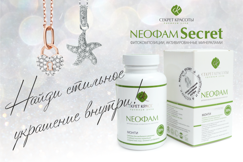Удача может улыбнуться и вам! Акция «NEOФАМ Secret – и красота, и… ювелирное украшение!» компании «Секрет Красоты» позволит Вам здесь и сейчас приобрести не просто эффективный премиальный продукт, но и возможность испытать свою удачу и получить в подарок стильное ювелирное украшение! Для этого не надо ничего регистрировать, делать перепосты, собирать лайки и считать баллы. Достаточно приобрести хотя бы один продукт, отмеченный особой акционной наклейкой Мы подготовили для Вас коллекцию стильных золотых и серебряных подвесок, которыми укомплектовали наши лучшие премиальные Литокомплексы.