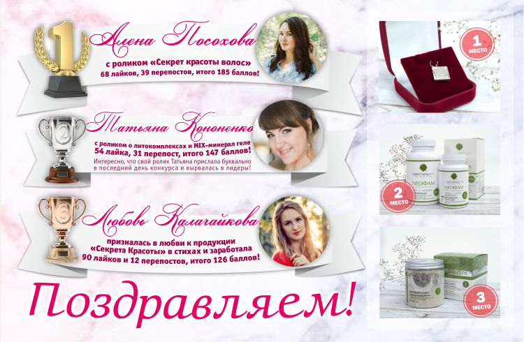 Конкурс видеоотзывов, который Компания «Секрет Красоты» проводила с 16 мая по 16 июля, завершен. Напомним, условия были предельно просты: нужно было снять видеоотзыв о любом продукте Компании и прислать его в группу. Победителей определяли наши читатели, голосуя лайками и перепостами. За один лайк начислялся один балл, за один перепост – три балла.