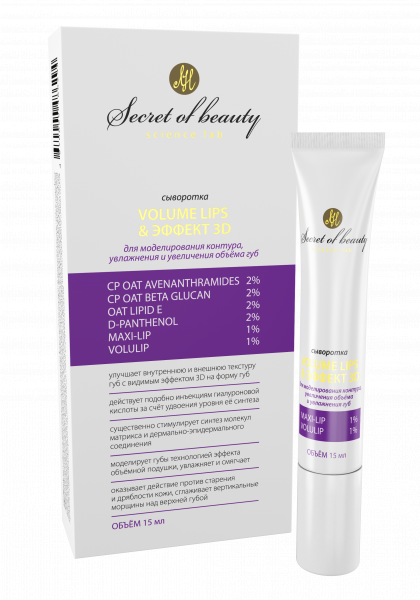 Самым выразительным, чувственным и нежнейшим объектом женского лица являются губы. Новый продукт – сыворотка «VOLUME LIPS & ЭФФЕКТ 3D» – разработан для моделирования контура, увлажнения и увеличения объёма губ. В реализации рецептуры сыворотки использована рекомендованная французской лабораторией Sederma технология архитектуры губ с эффектом объёмной подушки.
