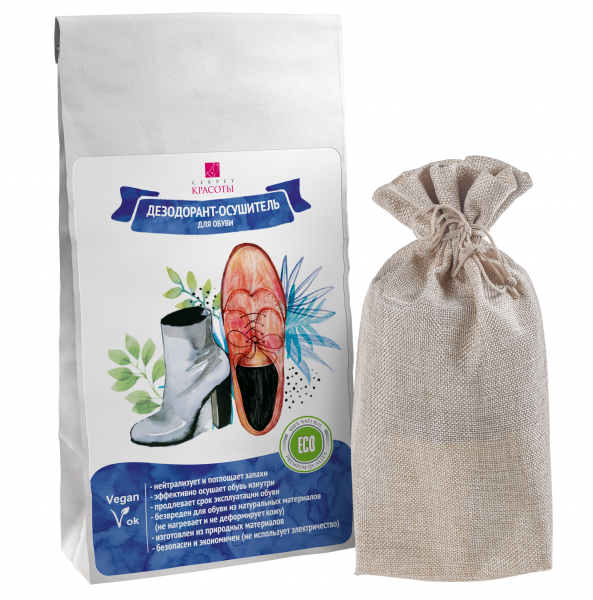 Дезодорант-осушитель поместить в обувь на ночь, по одному мешочку в каждую туфлю, кроссовку, или сапог. Утром извлечь из обуви и положить на батарею (при наличии отопления), или в теплое сухое место (летом).